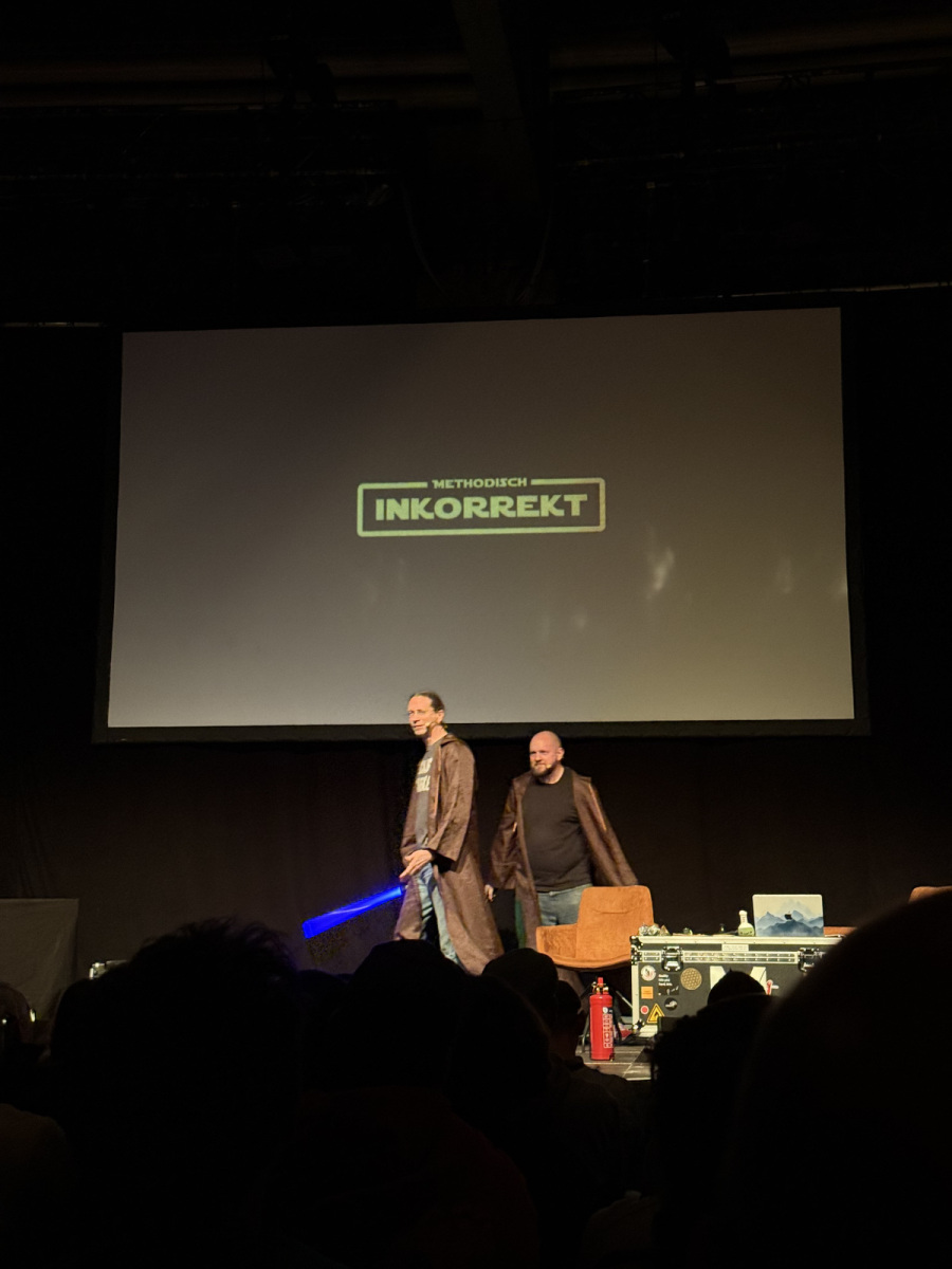 Das Zitat ist leicht abgewandelt aus dem Videointro der Show, Nicolas sagt am Ende: „Ich liebe, was wir tun.“ – und das merkt man Dr. Reinhard Remfort und Dr. Nicolas Wöhrl, besser bekannt als ‚Methodisch inkorrekt‘, an. Von der ersten Minute an macht es Spaß, den beiden zuzusehen – bislang hörte ich sie ja sozusagen immer nur in Ihrem Podcast. Mehr zur Livetour, deren letzter Termin eben letzten Freitag in Bielefeld stattfand, gibts hier.