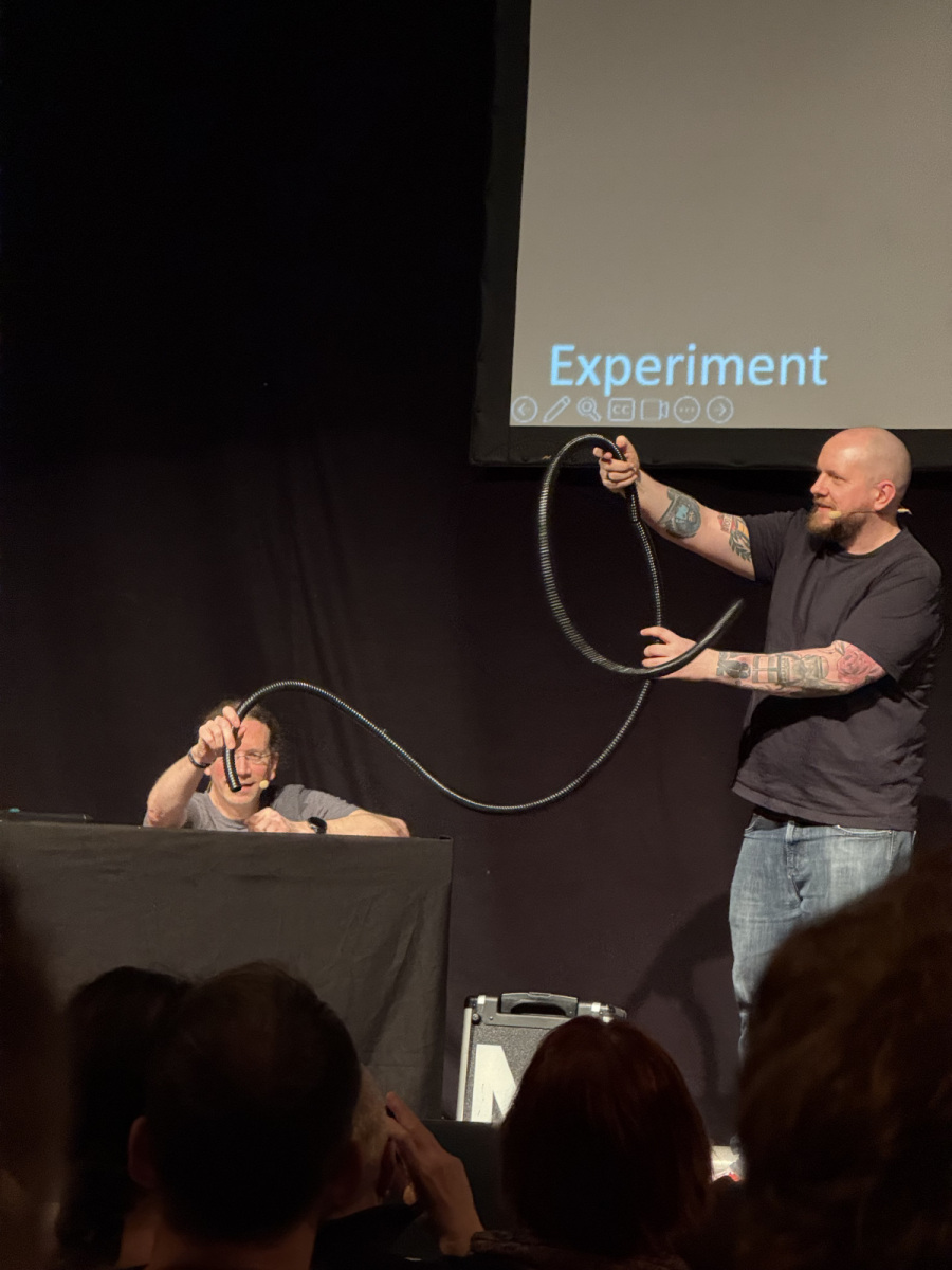 Während sie, wie auch im Podcast, den einen oder anderen Schwurbel auseinandernehmen, lernt man wirklich viel, über Wissenschaft an sich ebenso etwas darüber, wie wichtig Gaffa Tape auf einer Bühne sein kann. Zum Mitmachen erhielt man ein DIN A4-Blatt und einen Bierdeckel, den man erstaunlicherweise doch durch das eigentlich zu kleine Quadrat bekam – nachdem Reinhard erläutert hat, die Kantenlänge des Quadrats und damit auch (Pythargoras war auch da) die Hypotenuse eigentlich zu klein war für den etwa 7cm im Durchmesser messenden Bierdeckel. Ein Sprung von der 2. in die 3. Dimension war dann des Rätsels Lösung. Und auf dem Bierdeckel gab es übrigens in Form eines QR-Codes nützliche Zusatzinfos: https://linktr.ee/Mperium. Man merkt beiden an: sie meinen sehr ernst, was sie machen, verpackt in lustige Gags, spannende Experimente – da werden am Ende in der Zugabe auch schonmal T-Shirts ins Publikum geschossen oder Kartoffeln. Diese natürlich dann nicht mehr ins Publikum, sondern durch ein Gitter. Als Kinder des Ruhrgebiets haben sie so Pommes gemacht. Methodisch inkorrekt, eben.